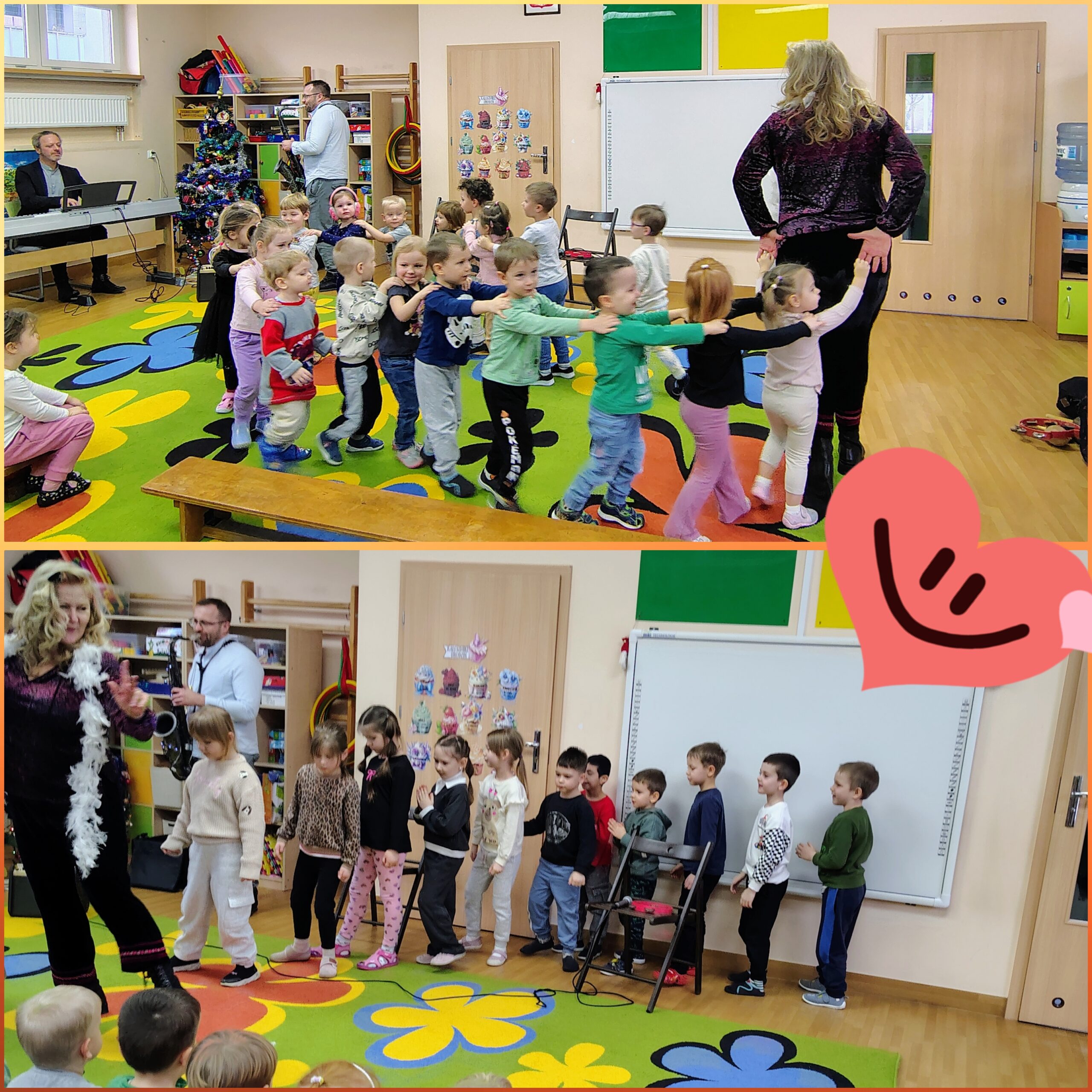 Podczas koncertu przedszkolaki poznały ciekawostki o toruńskich piernikach oraz postaci Mikołaja Kopernika. Pani Izabela zachwyciła dzieci swoim śpiewem, pan Mariusz akompaniował na pianinie, a pan Marcin zaprezentował niezwykły instrument – waltornię (róg). Mali słuchacze mogli również dowiedzieć się, jak wyglądały wcześniejsze „przodki” tego instrumentu, takie jak muszla czy róg mamuta.